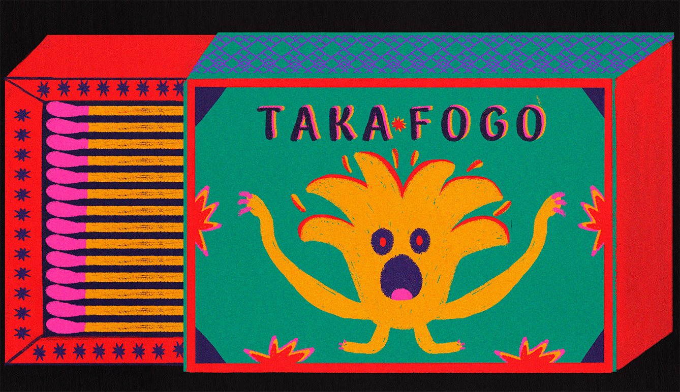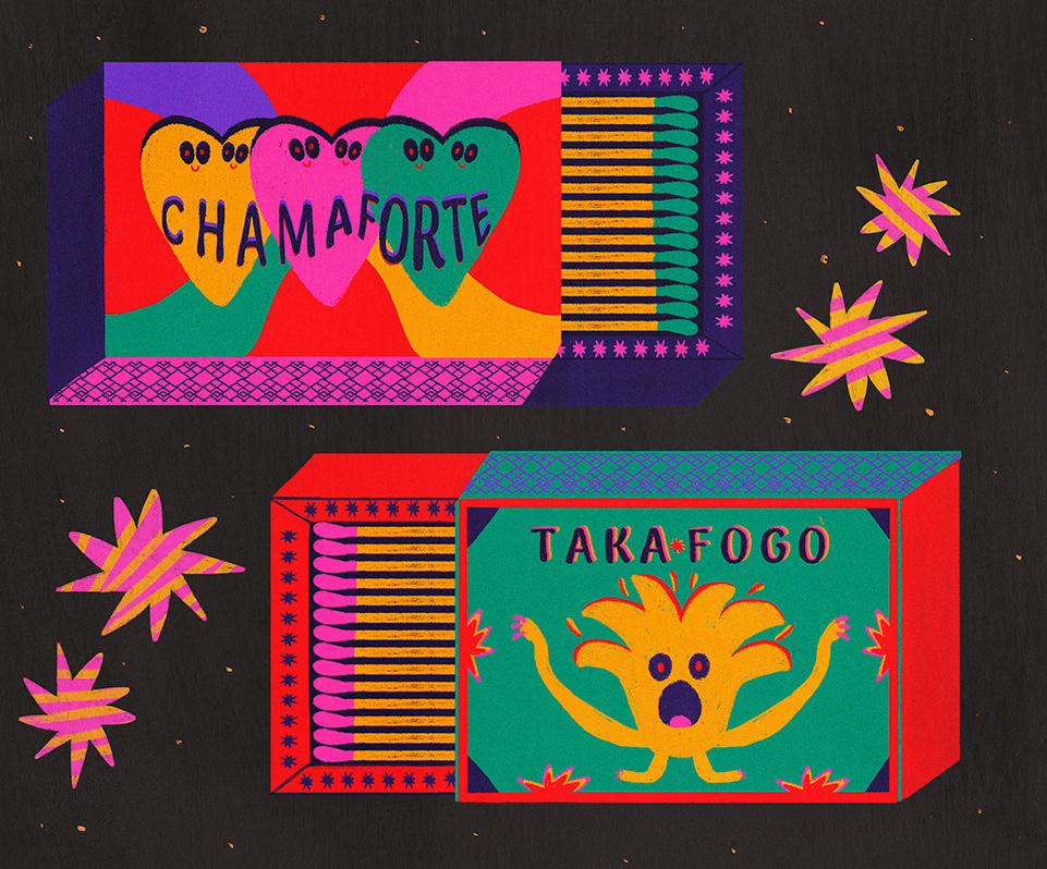 "taka fogo" e "chama forte" são minhas duas caixas mágicas, prontas para brincar com luz, cores e faíscas que pulam de um lado para o outro. cada risquinho é uma chama que dança, transforma e traz um pouco de magia ao que parece comum.