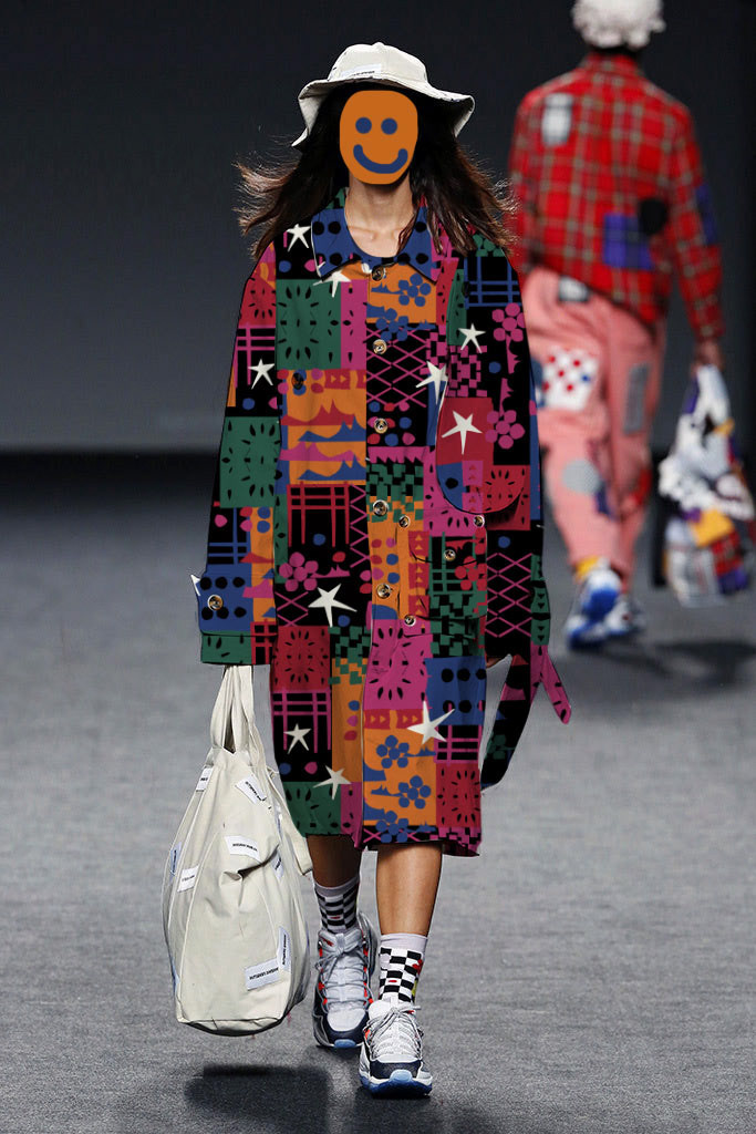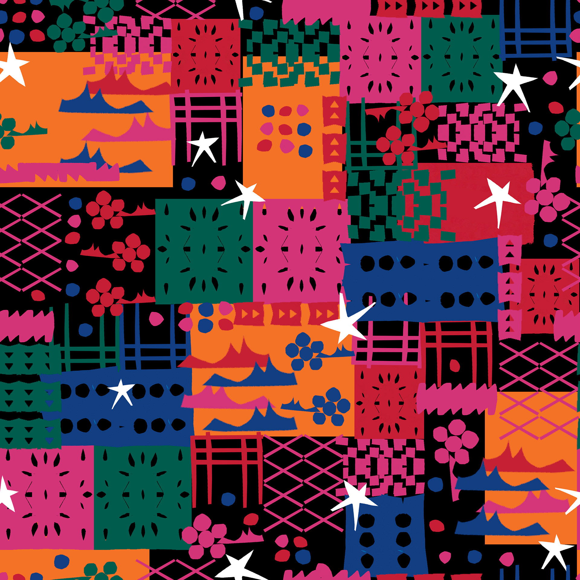 estampa feita com recortes assimétricos de papel colorido, sobreposições orgânicas e estrelas espalhadas como pontos de luz 💫