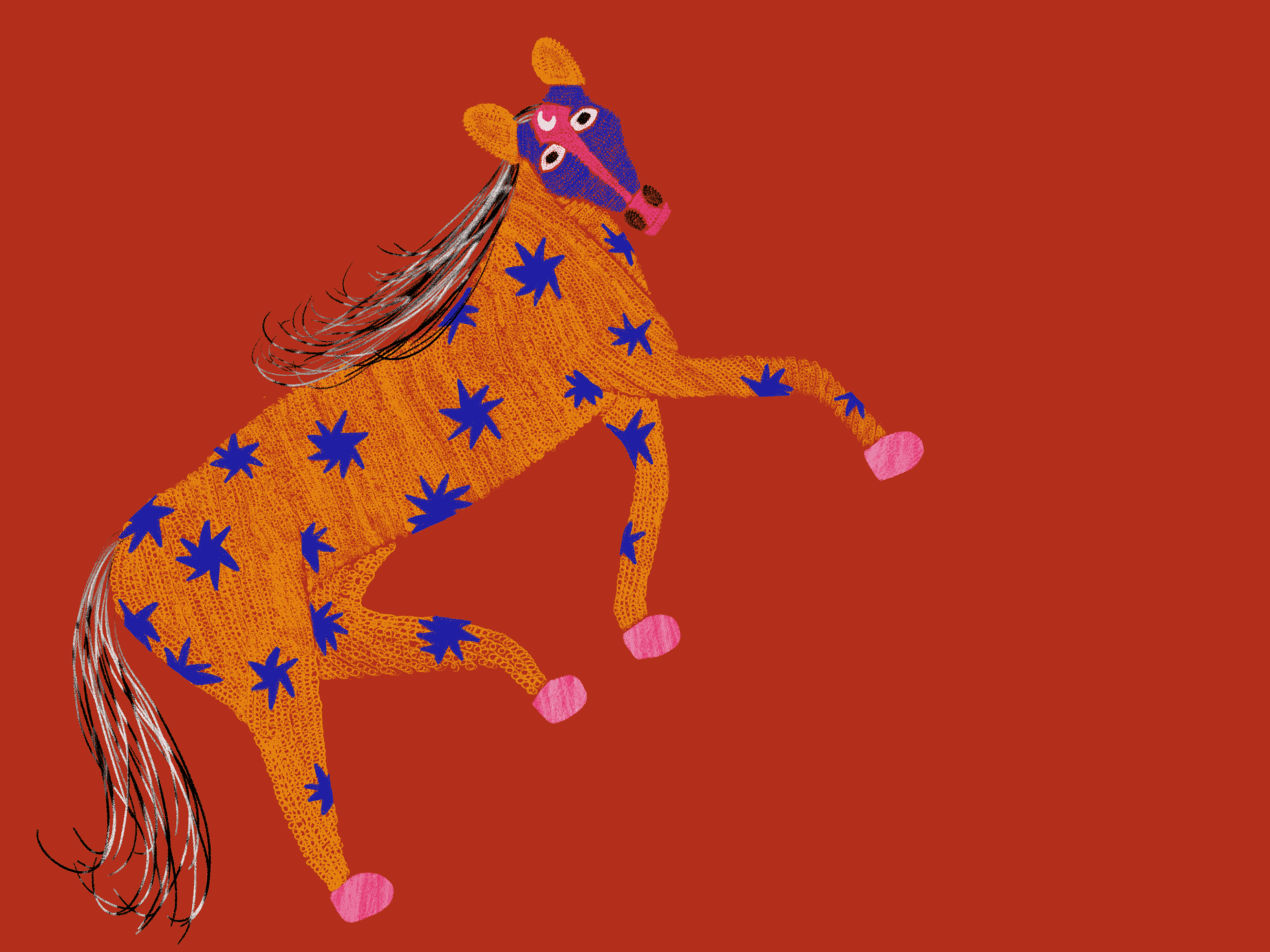 cavalo de tricot estrelado, crina azul e patinhas cor-de-rosa. Fugiu do celeiro e corre solto, no seu próprio ritmo 🐴💫